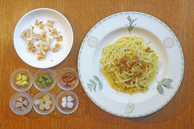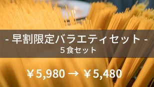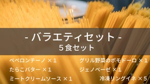 ペペロンチーノ×1、たらこバター×1、ミートクリーム×1、ジェノベーゼ×1、グリル野菜のポモドーロ×1、クイックパスタ(冷凍リングイネ140g)×5