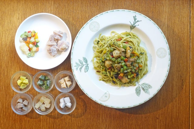 具材 :チキンソテー、彩り野菜、バジルキューブ、オリーブオイルキューブ、にんにくキューブ、味ブイヨンキューブ、上新粉水キューブ、アンチョビ水