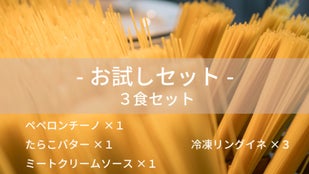 ペペロンチーノ×1、たらこバター×1、ミートクリームソース×1、クイックパスタ(冷凍リングイネ140g)×3