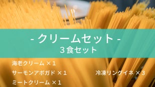 サーモンアボカドクリーム×1、海老クリーム×1、ミートクリーム×1、クイックパスタ(冷凍リングイネ140g)×3