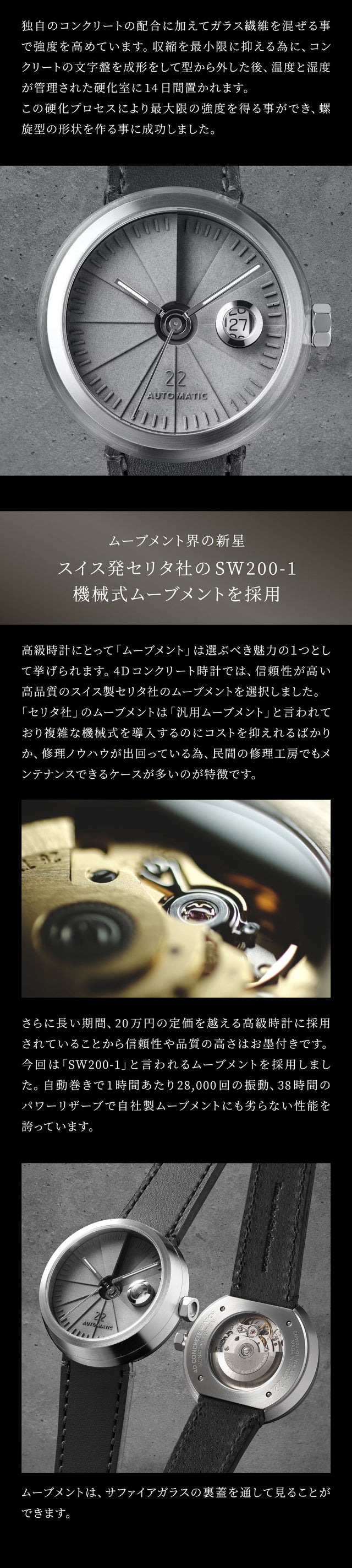 「Makuake(マクアケ)」は、実行者の想いを応援購入によって実現するアタラシイものやサービスのプラットフォームです。このページは、 プロダクトカテゴリの 「出来る男は休日も手元から風格を!4Dコンクリート機械式自動巻き腕時計」プロジェクト詳細ページです。