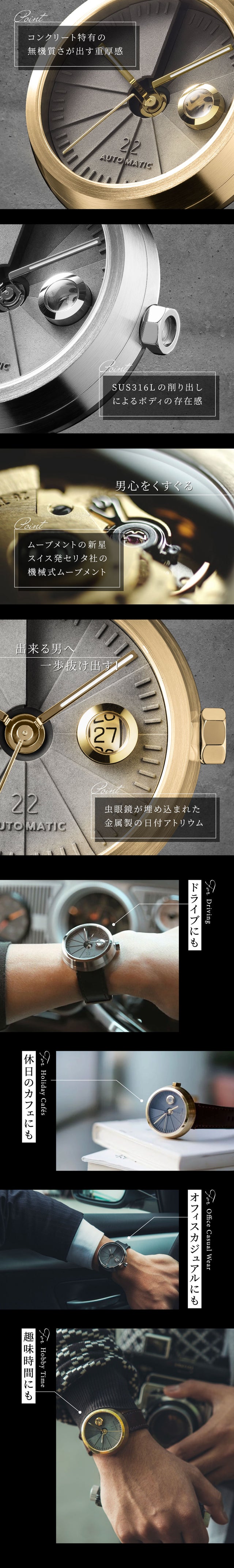 - コンクリートが生み出す重厚感と金属の削り出しが生み出す高級感!出来る男の休日は腕元から