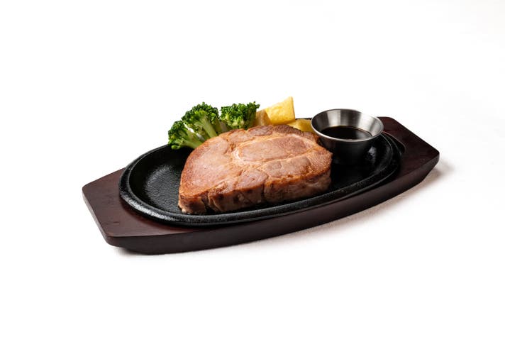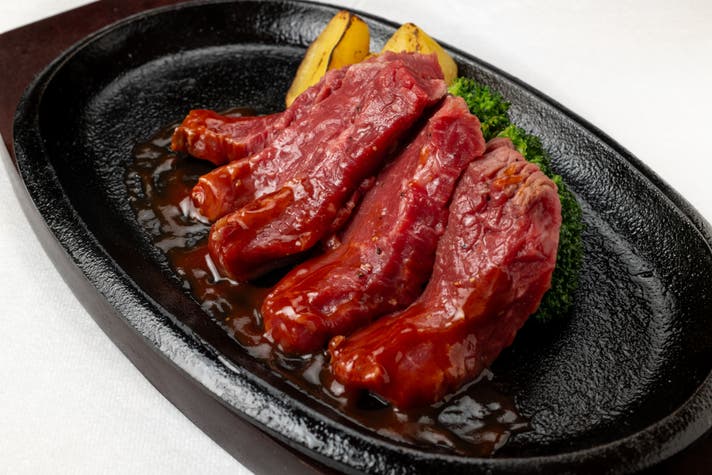 焼きあがったステーキを鉄板に乗せたまま、ソースを豪快にかけ、「ジューッ!」という音と共にテーブルへ。