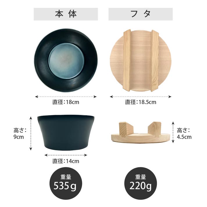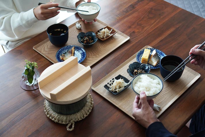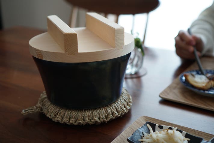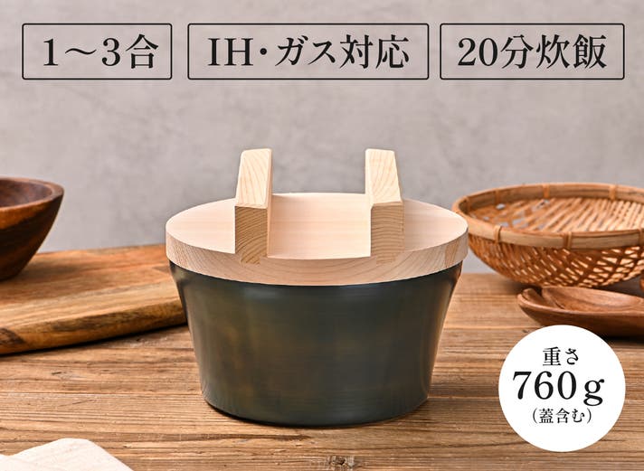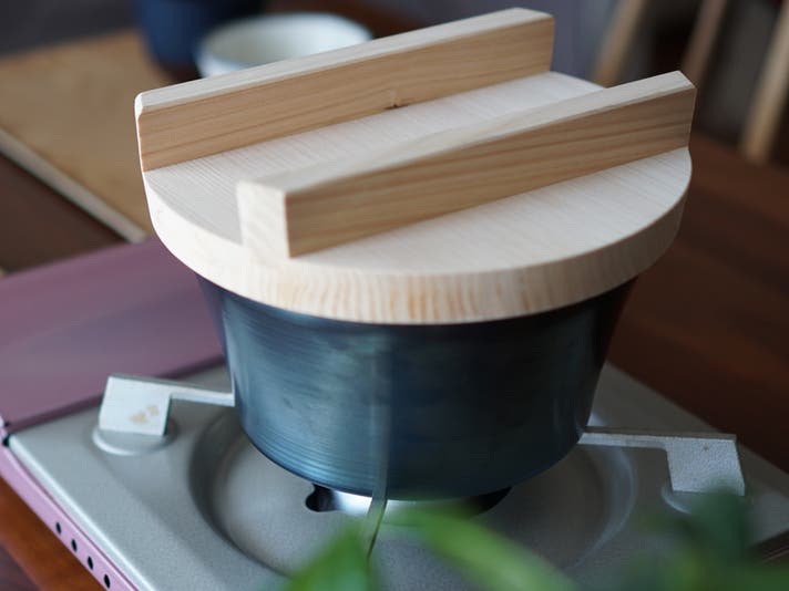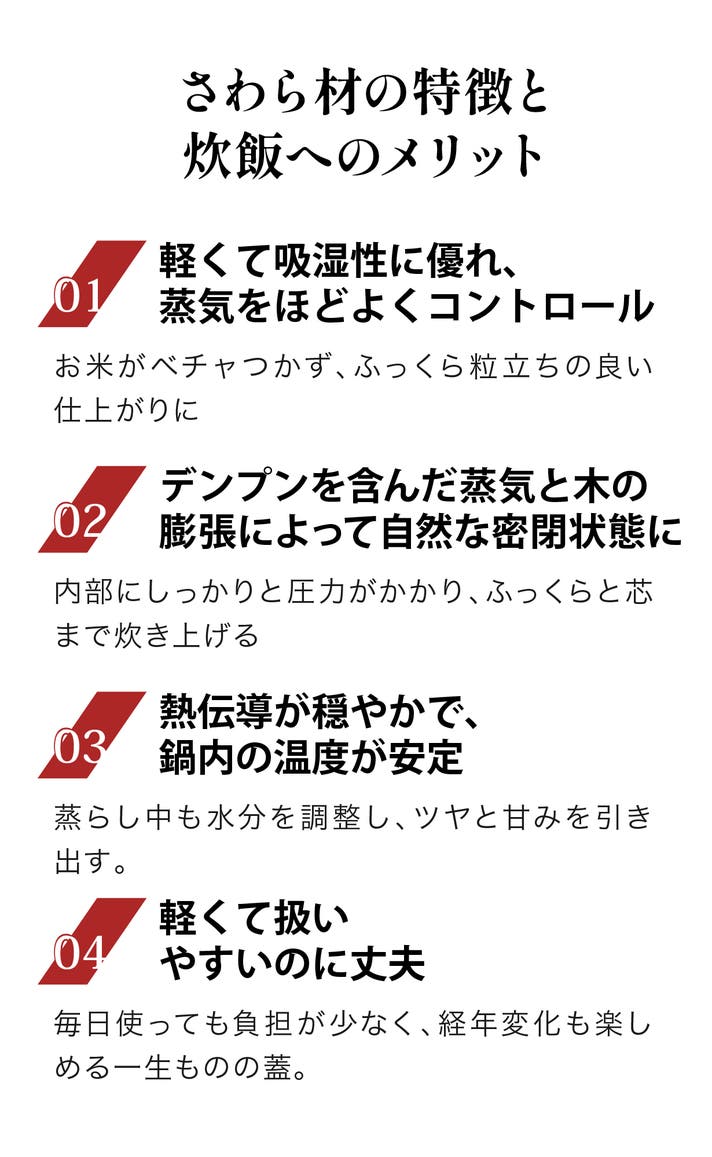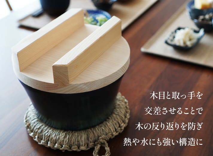 ノスタルジックな木蓋は、国産のさわら材を使用しています。さわらは古くから飯びつや桶、樽などに使われてきた伝統的な木材で、水や熱に強く、炊飯にとても適しています。