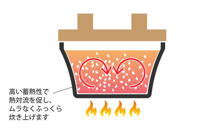 素材はこだわりの鉄。熱まわりが良く、お米の芯までふっくら仕上げます。さらに、毎日のごはんから無理なく鉄分補給できるのも、鉄ならではの魅力。