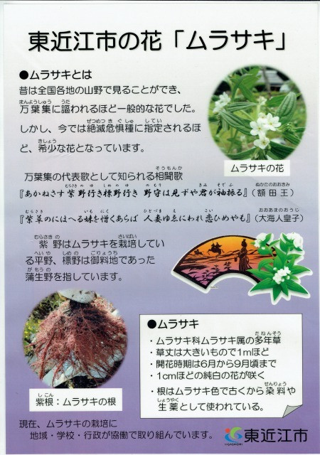 シコンとは、東近江市の花「紫草(ムラサキ)の根」のことで、紫色の根から抽出される「シコニン」を染織に使えば、冠位十二階位最高位の色「濃紫の染料」になることから、「紫の根=シコン」と呼ばれ、昔から重宝されてきました。