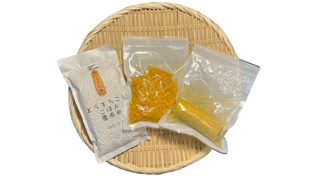 今夏フレッシュとうもろこしの直送販売時に添付していた、芯を使ったとうもろこしご飯のレシピがとても人気でした。その味を、いつでもたべてもらいたい、との想いで作り上げたのが今回の「とうもろこしご飯の素」です。