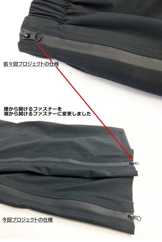 上記の変更によりファスナーでのレインパンツ装着が可能になりました。