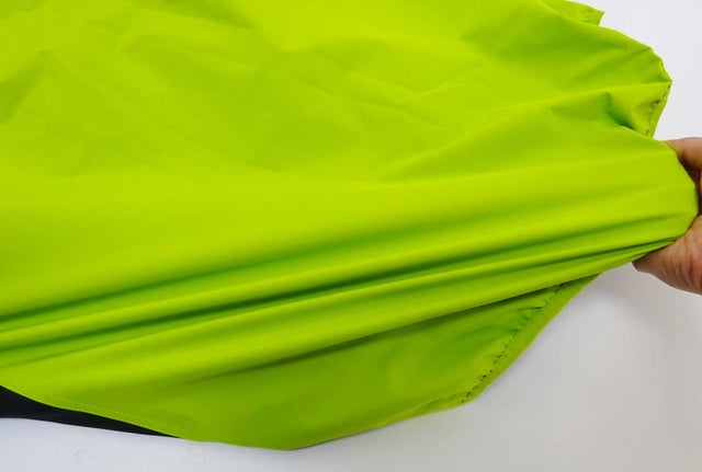 生地にカチオン糸を使った霜降り調のリュックサックの上から着れるレインジャケットです。