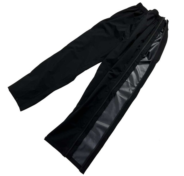 上から下まで全開きするファスナーを両サイドにつけたレインパンツ。