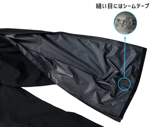裏地にはPUラミネートを使用し、全ての縫い目にシームテープをすることで水の侵入を防ぎます。