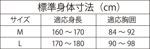 Lサイズ:適応身長170~180cm 適応胸囲90~98cm