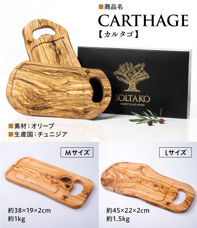 【CARTHAGE】はまな板に必要な「刃当たりの良さ」「水切れの良さ」「適度な重さ」この三つの要素を兼ね備えた、チュニジア産オリーブの一枚板を使用した100%天然のまな板です。