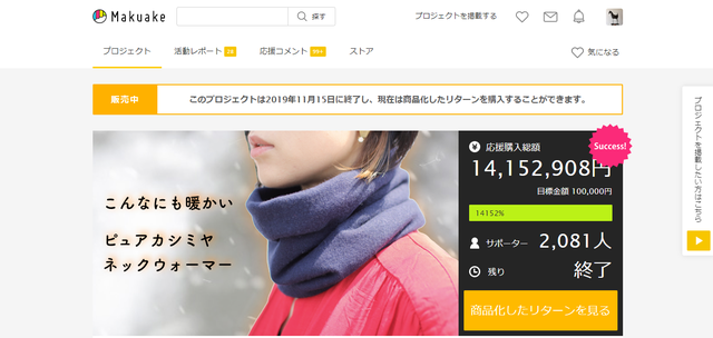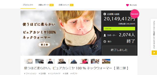 過去のプロジェクトには累計3400万円以上を集めたピュアカシミヤ100%ネックウォーマーや、カシミヤ×シルクの贅沢すぎるブランケットなど、とことん素材に妥協をしないモノづくりで皆様の支援を集めています。