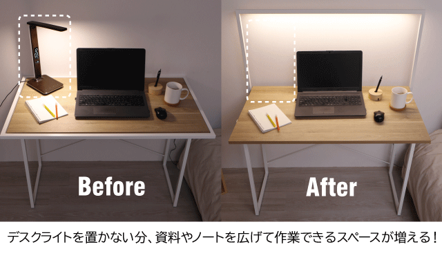 メリット1:照明スタンドがない分、卓上が広々使えるため仕事効率もアップ!
