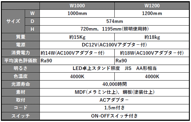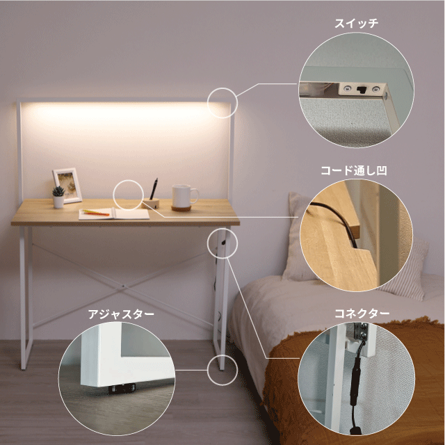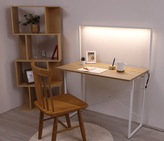 - 机と照明が一体型になっていることにより照明スタンドを置く必要がなく机全体が広々使える!