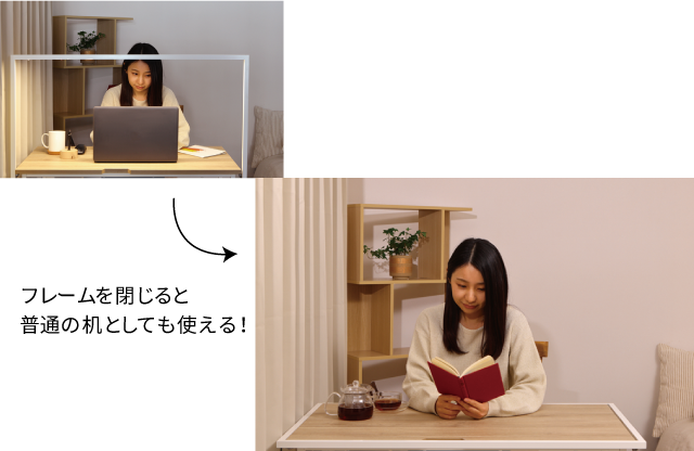 オフィス仕様ではなく自宅のインテリアにも合わせやすいシンプルでおしゃれなデザイン。金属フレームを閉じると一人用の食卓としてやちょっとした作業スペースとしても利用可能。一人暮らしのお部屋にもぴったりです。