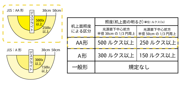 JIS規格とは日本工業規格(JIS)において勉強・読書に必要なLED卓上スタンドの机上面照度(机の上の明るさ)の区分のことであり、AA形はA形や一般形のものよりも広い範囲を明るく照らせることが分かります。