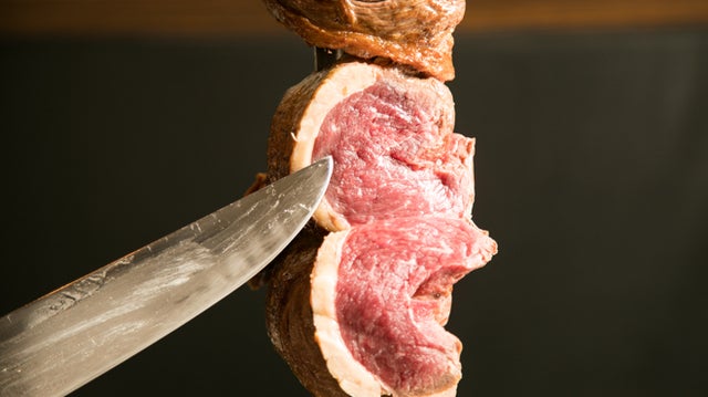 ②本場ブラジルのシュラスコ職人から師事を受けイタリアン、フレンチの名店で腕を磨いたシェフがその技術・知識で丁寧に焼き上げ1枚1枚を目の前でカット。