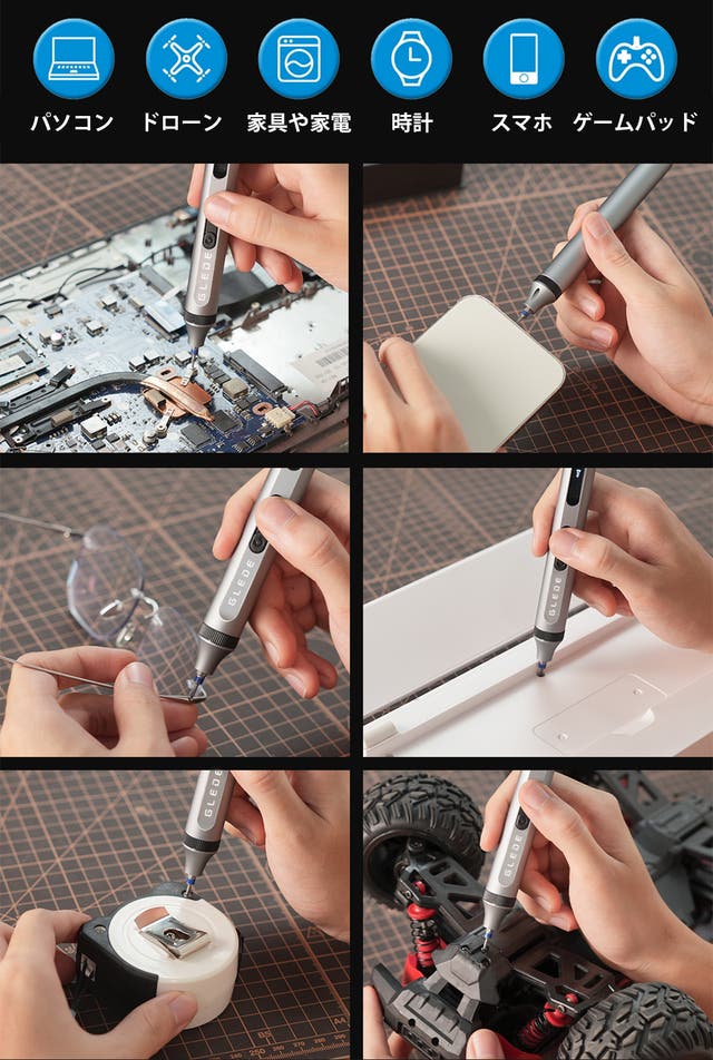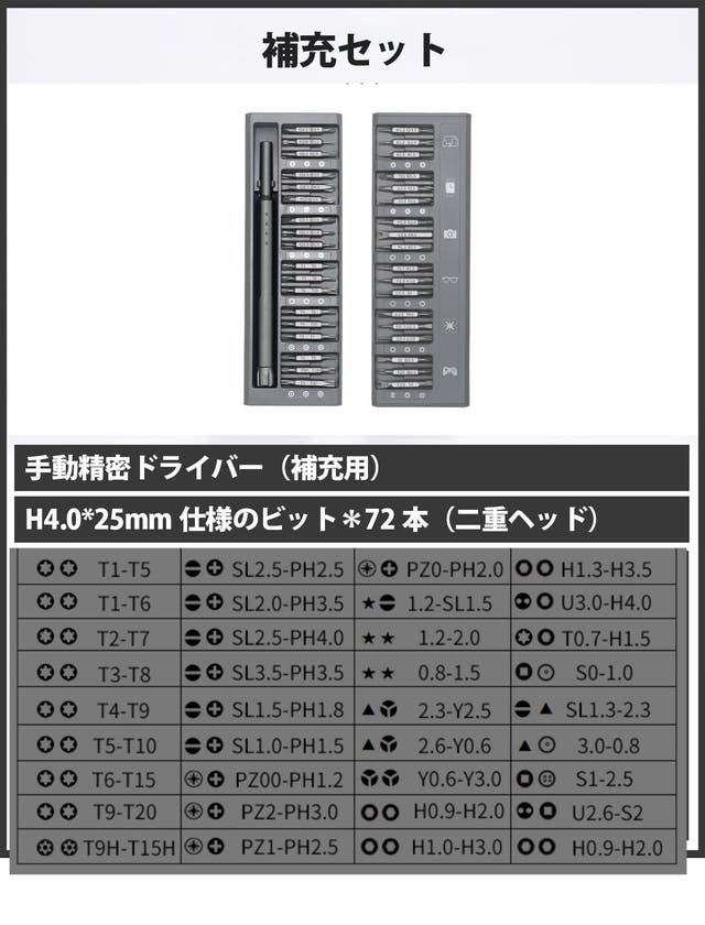 A: 当社の電動ドライバーセットには102以上の異なるビットが含まれており、スマホ、家具、家電、パソコン、メガネなど、さまざまな用途に対応しています。