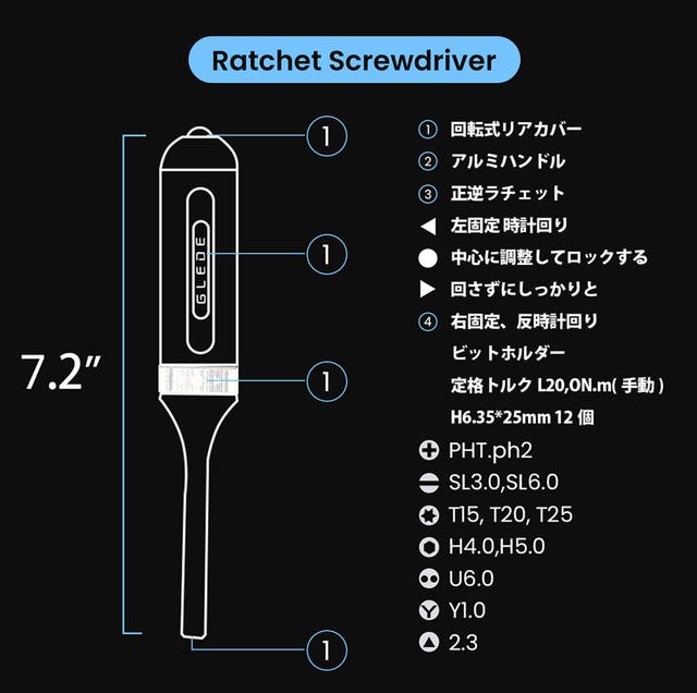 - ラチェットドライバーは回し方向を調整でき、さらに180度角回転アングルドリルが用意!