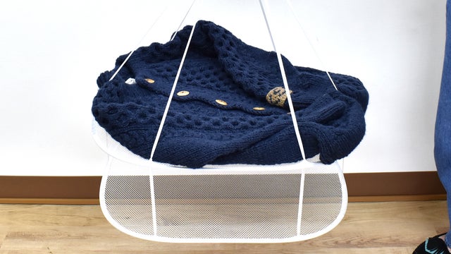 ハンガーに吊るすとニットの重みでどんどん伸びてしまいますので、平干しネットなどを利用してください。