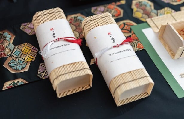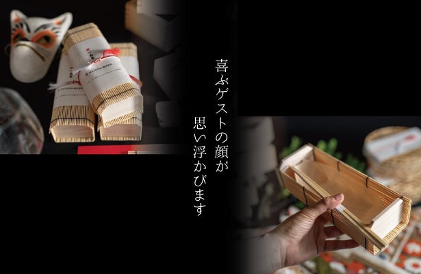 外国人にも人気の竹細工のカゴは、繊細さと温かみが魅力。取り皿としてお客様にご使用いただくカゴには、お客様にメッセージをお届けする「のし紙」をセットします。カゴを取り皿としてご使用いただく事で、パーティーが格調高いものになります。