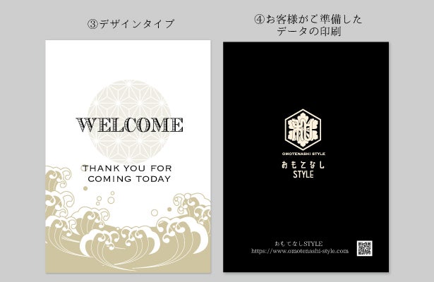 【1.SNSパネル】FaceBook、インスタ、ツイッターなどの窓空きパネル、海外逮捕写真撮影などのパロディなど【2.メッセージタイプ】頂いたメッセージをテンプレートにいれて印刷致します。【3.デザインタイプ】どのシーンにも合う「WELCOME」の和風デザイン【4.お客様デザイン】社名・ロゴ・屋号デザイン+メッセージをレイアウトさせていただきます。※新規のデザイン制作は別途料金が発生いたします。※ご注文後、ご注文確認メールをお送りしますので、印刷する内容をご返信メールにてお申し付けください。メッセージをご希望でない方は無地でお届け致します。