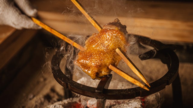 自身の出身地である川俣シャモをじっくり炭火であぶると表面がパリッと香ばしく、中はジューシーに焼き上がります。