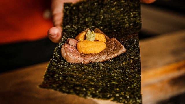 柔らかくとろけるような幻の所沢牛と、まろやかで濃厚なウニのマリアージュ。そして、それを包みこむ香ばしい焼き海苔。