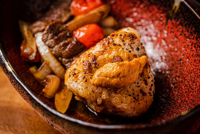 川越ブランド米の河越米とウニをおにぎりにし、仕上げにすき焼きのタレで香ばしく焼き上げます。