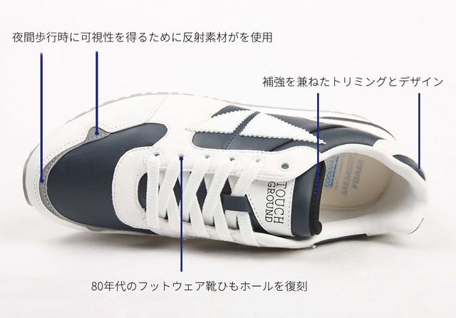 ジョガースタイルのデザインでありながら、ホワイトと落ち着いたネイビーのカラーリングで、あらゆるシーンのファッションスタイルにも合わせやすいデザインに仕上げており、きっと、日々のコーディネートに活躍してくれます。TOUCH GROUNDは、これまで幾度となくファッションブランドへのランウェイへの提供やコラボ企画を行っています。