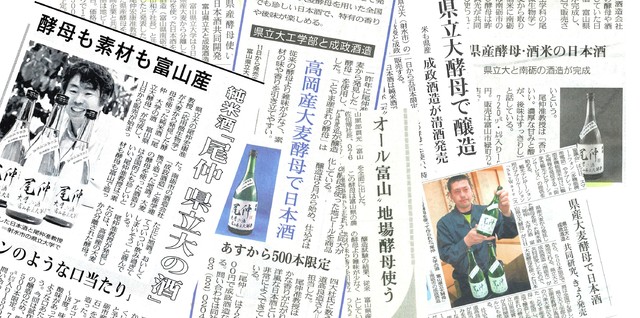 純米吟醸酒「尾仲」の最大の特徴は「とやま産まれの酵母」を使って醸造したという点です。とやま産まれの酵母は2011年に富山県立大学生物工学研究センターにて、富山県高岡市産二条大麦麦芽より発見されました。当初立山地ビール「星の空」の醸造酵母として使われましたが、従来のビールに比べ、酵母の臭み(発酵臭)が少なく、香り豊かに素材の良さを引き出す酵母ということで、清酒酵母としての使用を成政酒造にお願いして、清酒「尾仲」は誕生しました。