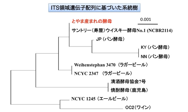 「とやま産まれの酵母」は東京大学大学院農学生命科学研究科にて分子系統解析が行われ、清酒酵母とは違う遺伝子系統であり、サントリーがウイスキー酵母No.1として寄託菌株登録している酵母Saccharomyces cerevisiae NCBR2114と遺伝子系統が同じであることが分かりました。(日本農芸化学会2016年度大会一般講演にて発表)