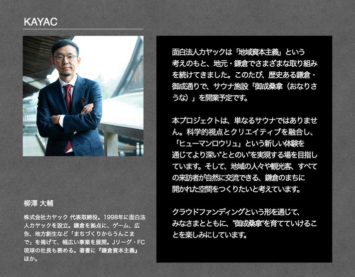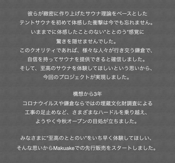 「Makuake(マクアケ)」は、実行者の想いを応援購入によって実現するアタラシイものやサービスのプラットフォームです。このページは、 地域活性化カテゴリの 「【鎌倉発サウナ】ヒューマンロウリュで圧倒的サウナ体験!科学が導く至高のととのい!」プロジェクト詳細ページです。