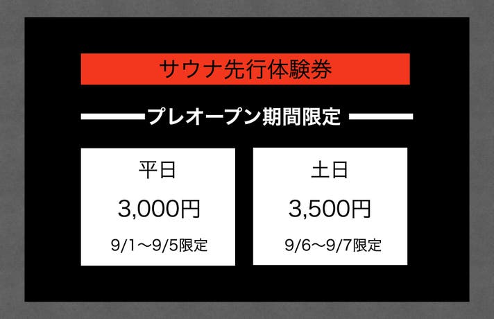 9/1~9/3、9/5のプレオープンの平日期間、先行してサウナを体験できるチケットです。