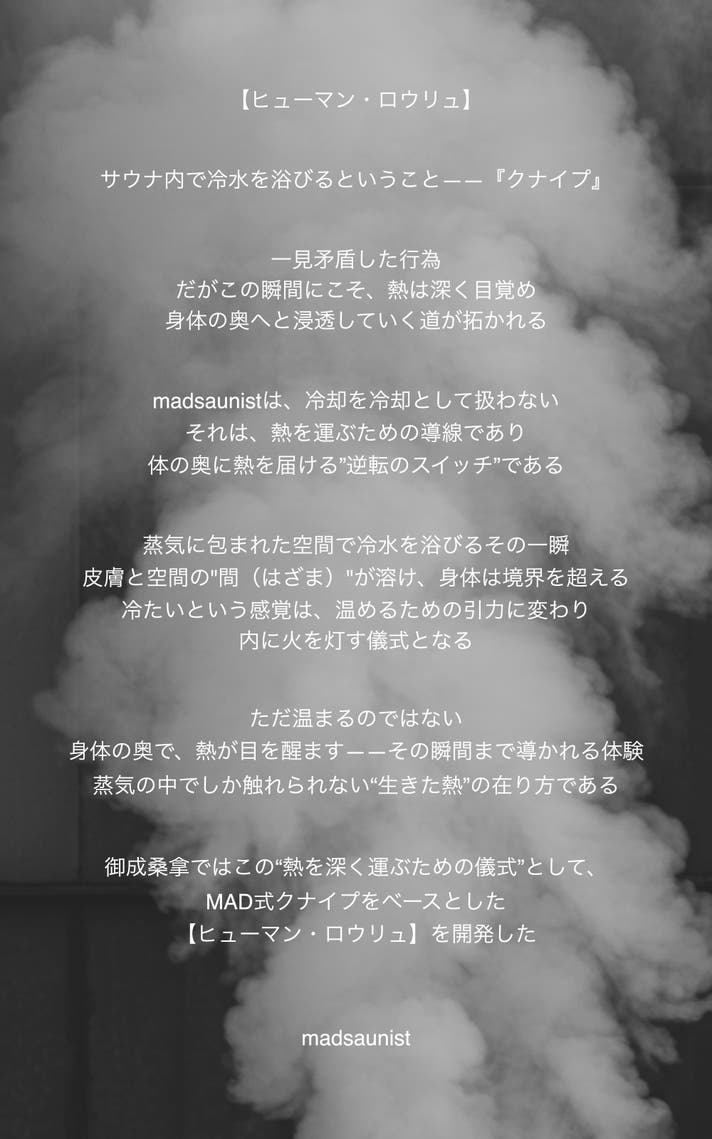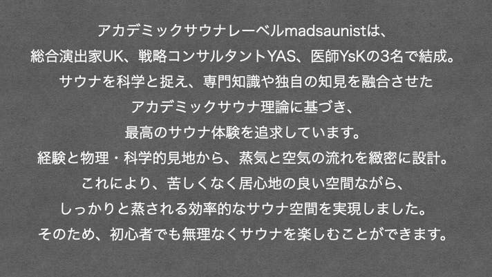 今回のサウナ施設のプロデューサーである「madsaunist」と貸切でサウナに一緒に入り、サウナパフォーマンスを体験できる券となります。日程は購入者と調整の上、決定いたします。
