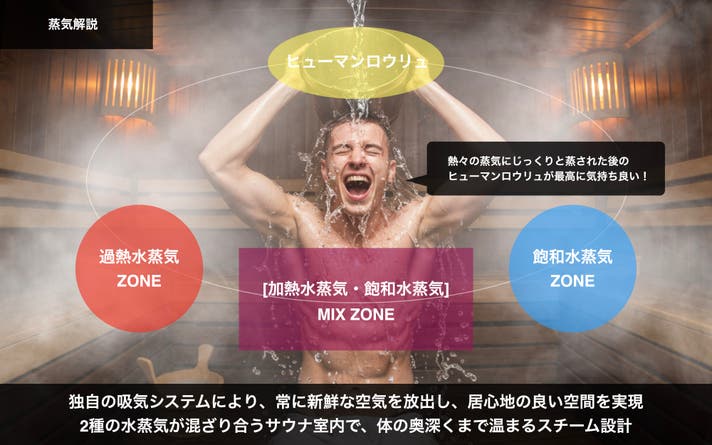 - 過熱水蒸気×飽和水蒸気×ヒューマンロウリュ=科学が導く至高の"ととのい"。圧倒的サウナを実現!