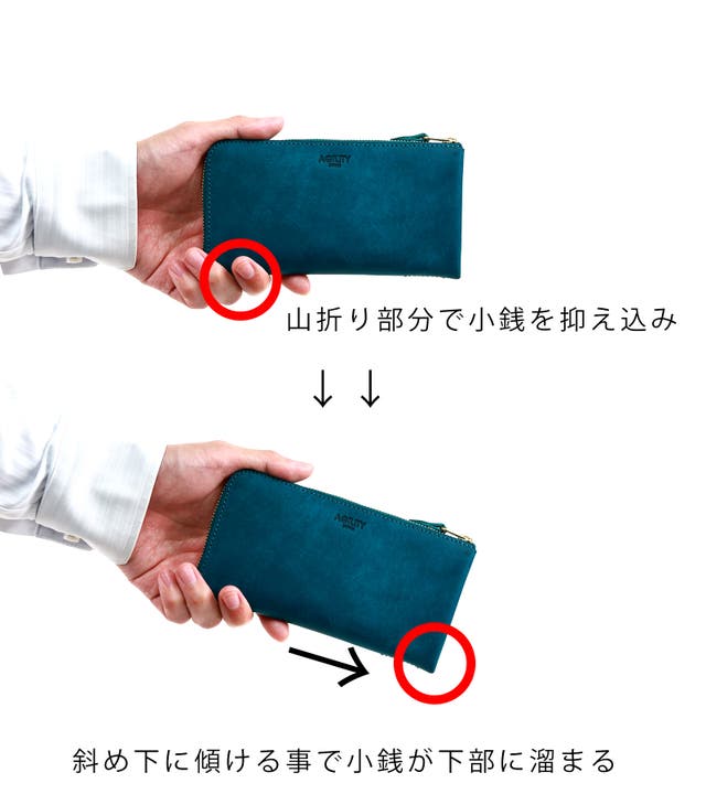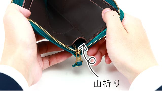 斜めに下に傾けて、小銭を後ろにまとめるようにしてファスナーを開閉します。