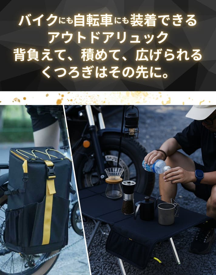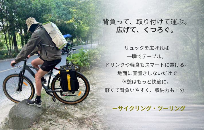 展開することでテーブルとしても使用できる多機能バイクギアです。