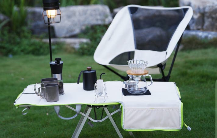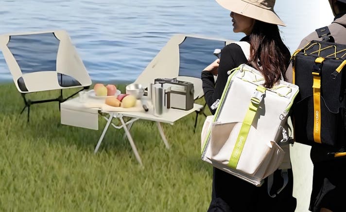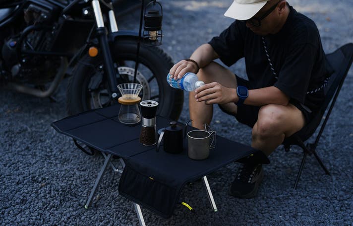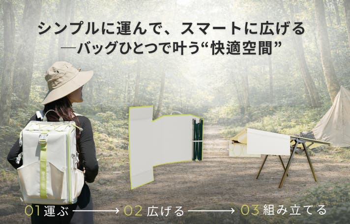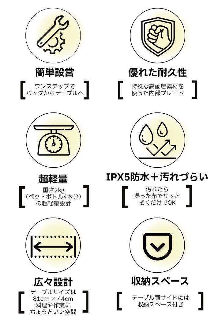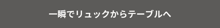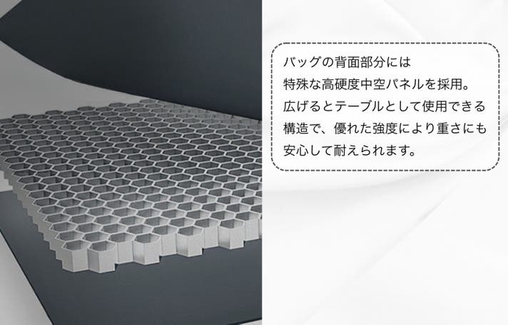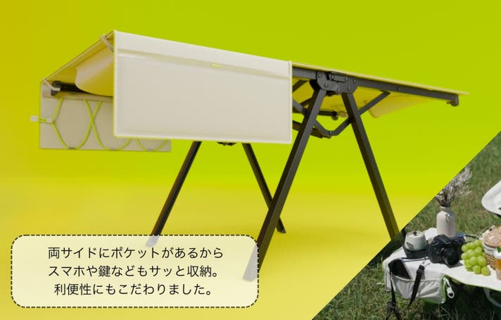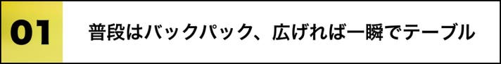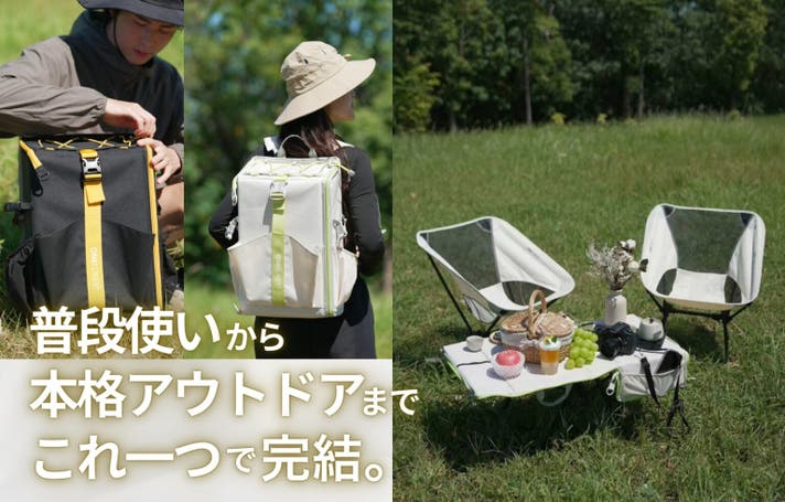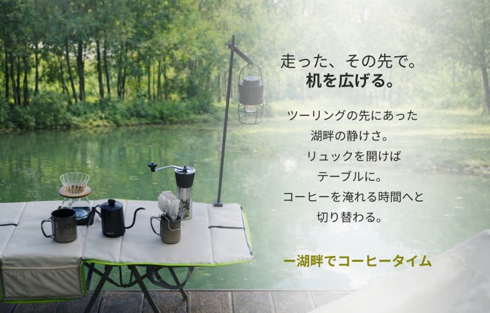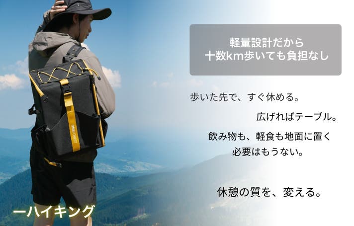 シーンに合わせて、バッグとテーブルをワンステップで切り替えられる、新しいアウトドアスタイルです。