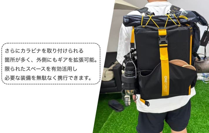 収納ポケット以外にもONE FOREST O2はカラビナを取り付けれる箇所も多く、外側にもギアを拡張可能。見た目以上に必要な装備を持ち運びできます。