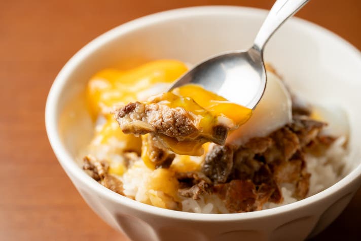 半熟卵を乗せたらあっという間にご馳走「猪丼」。豚肉と似ているものの、より濃厚な旨味と牛肉よりさっぱりとした自然な甘みが楽しめる。