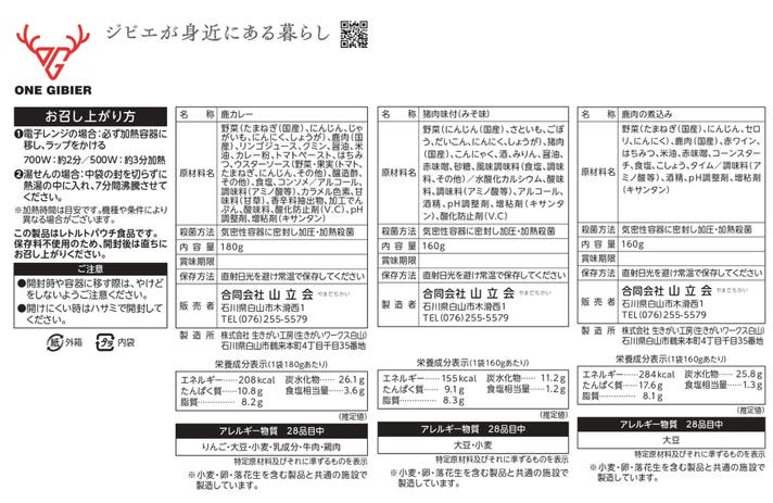 今回お届けするのは、国産の鹿と猪を贅沢に使ったレトルト6種類。極力、私たちの地元・石川県産の野菜を中心に、国産の食材にこだわって仕上げました。温めるだけで本格派の味が完成します。