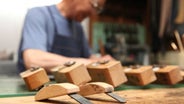この製法において重要なポイントは、表革と裏革の重なる部分を極力薄くして、不自然な段差が現れないようにする技術です。