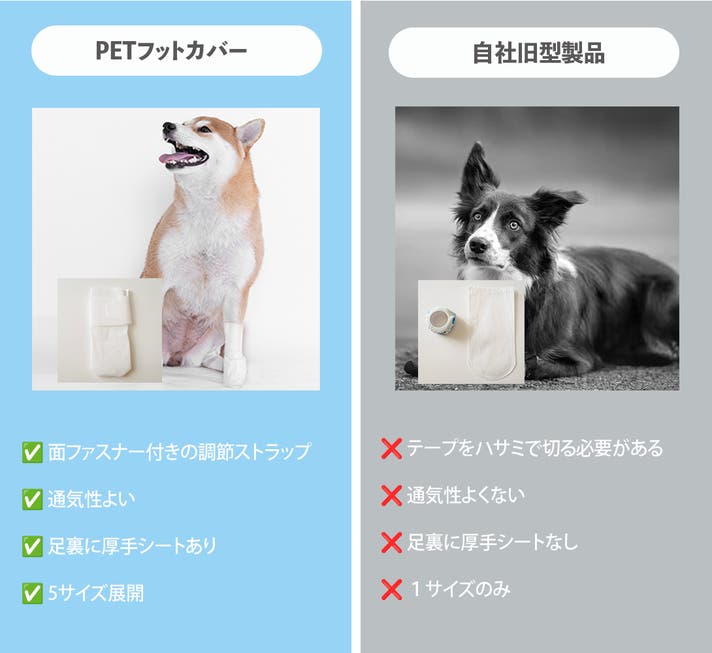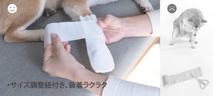 従来のフットカバーはハサミで粘着テープをカットする必要があり、粘着テープがワンちゃん・猫ちゃんの毛を引っ張ったり巻き込んだり・・・