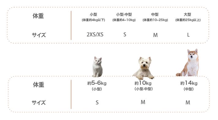 - 4kg以下の小型も、40kgの大型まで、五つサイズご対応する。