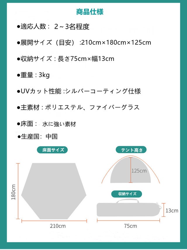 わたしたちはワンタッチレジャーテントセットを製作するために、現在工場とデザイン、仕様を実現できるよう、プロジェクトを誠心誠意進めています。 製造スケジュールについては、現在プロジェクト成功を想定した数で調整しておりますが、想定を上回る応援購入の申込みがあった場合、製造工程上の都合や配送作業に伴う止むを得ない事情によりお届けが遅れる場合がございます。 上記のようにプロジェクトページに記載している内容に変更がある場合は、できるだけ早く活動レポートなど共有を行なっていく予定です ※使用感等に関する返品・返金はお受けいたしかねます。 ※開発中の製品につきましては、デザイン・仕様が一部変更になる可能性もございます。 ※応援購入の数が想定を上回った場合、製造工程上の都合等により出荷時期が遅れる場合がござい ます。配送に遅れが生じる可能性が判明した場合、直ちにご報告させていただきます。 ※本プロジェクトを通して想定を上回る皆様から応援購入頂き、現在進めている環境から量産体制 を更に整えることができた場合、正規販売価格が販売予定価格より下がる可能性もございます。 ※本プロジェクトの実施において十分確認は行なっておりますが、並行輸入品、類似品が発覚する可能性がある点、ご了承願います。 ※初期不良について お届けから2週間以内にご連絡いただければ、パーツ交換または全交換にて対応させていただきます。必ず期限内に内容の確認をお願いいたします。 応援購入サービスの性質上、以上の注意点につきましてあらかじめご理解とご了承いただいた上でご支援くださいますよう、よろしくお願い申し上げます。