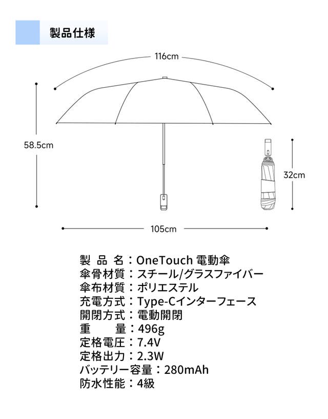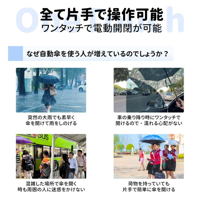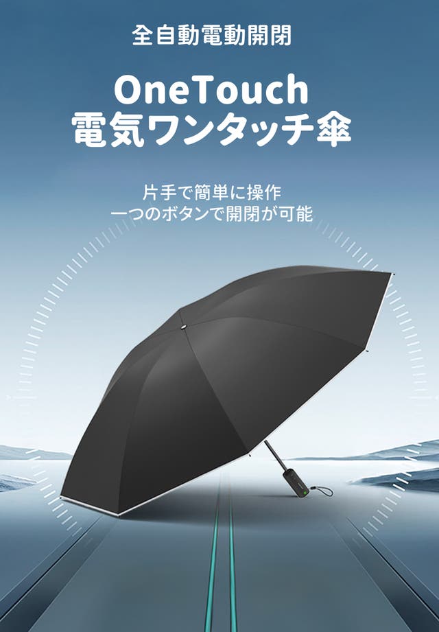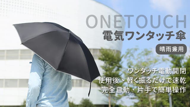 OneTouch電気ワンタッチ傘は、電気エネルギーを機械エネルギーに変換し、わずか2秒でスムーズに電動で傘を開閉できます。すべて片手で操作可能で、ビジネスバッグや買い物袋を持ちながらも簡単に使えるため、忙しい方に最適です。