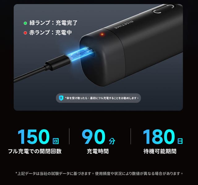 モーターはIPX4の防水規格を備えており、フル充電で約150回の開閉が可能です。待機時間は180日で、90分の充電でフル充電できます。